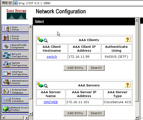 安装完后,点击Network Configuration页面,按照拓扑的结构指定交换机(AAA Client)、ACS(AAA Server),ACS与交换机的共享密码为cisco、然后选择RADIUS(IETF)认证、log Update/Watchdog Packets from this AAA Client