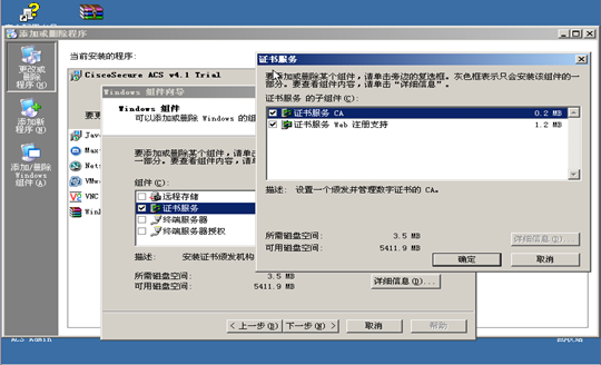 在添加/删除windows组件中选中证书服务,然后下一步开始安装。安装的过程这里就不详细说了,全部选用缺省的配置,有提示筐出来就选择是就可以了。