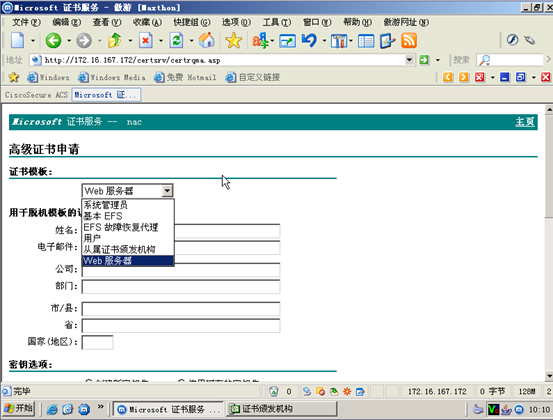 在ACS服务器的IE浏览器中输入http://172.16.167.172/certsrv进入证书申请页面,这里因为我把ACS和CA装在同一台服务器,所以看起来就像自己给自己颁发证书了呵呵。